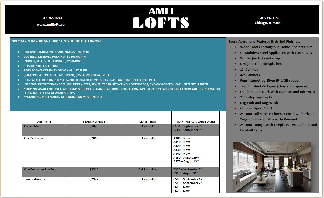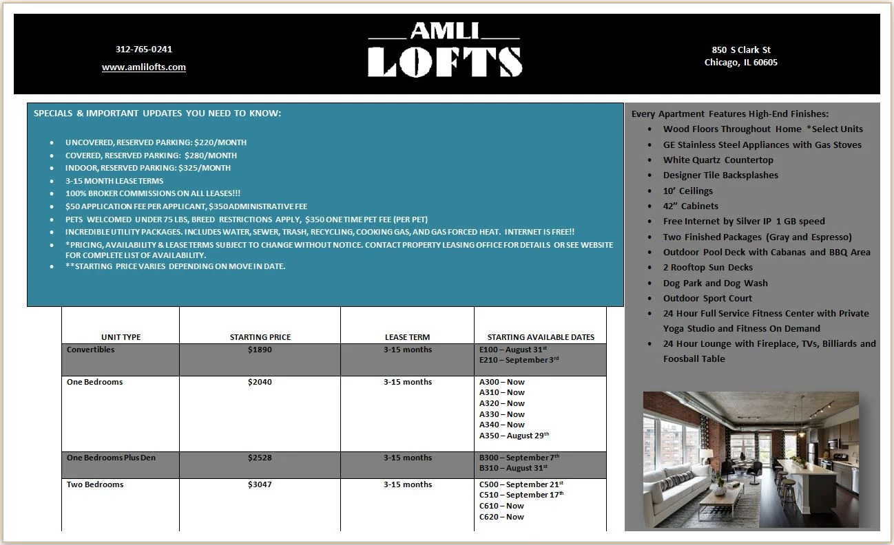 Unit 5805: $2,430, Available NOW (can start a lease up to two weeks from application), Northwest Corner: Incredible Lake/City views, Hardwood floors, Penthouse Finishes with Stainless Steel Appliances and Granite Countertops