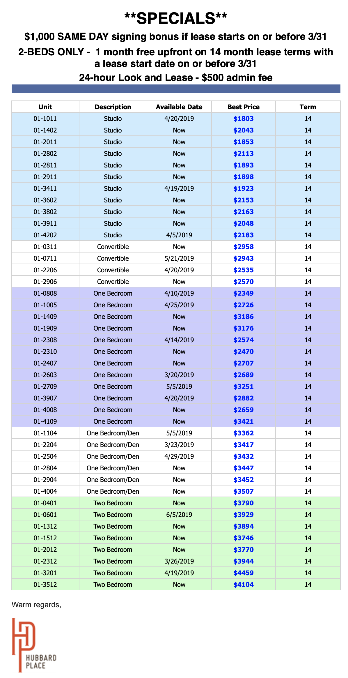 Unit 5312: $2,690, Available 4/06/19, South-Facing; Hardwood floors & Stainless steel appliances